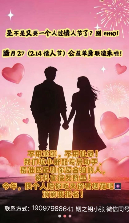 岳阳姻之钥婚恋公司与岳阳婚恋协会联合举办免费公益联谊活动在腊月27(2.14情人节)在王家河公园,都是岳阳市区和岳阳三区六县的。欢迎大家过来参加