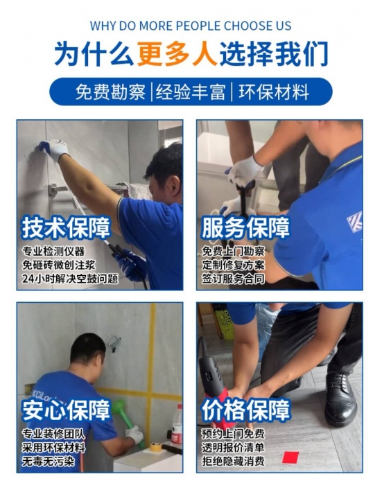 专业维修瓷砖空鼓,翘边翘角,施工区域质保五年,不换砖,不砸砖,快速施工,干净无灰尘