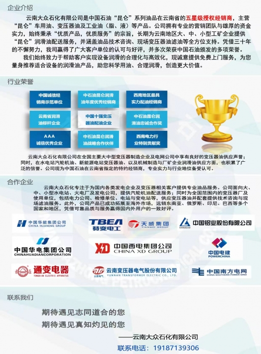 云南大众石化有限公司是中国石油“昆仑”系列油品在云南省的五星级授权经销商,主营“昆仑”车用油、变压器油及工业油(脂、液)等产品。公司拥有专业的营销团队与雄厚的资金实力,始终秉承“优质产品,优质服务”的宗旨,长期为云南地区大、中、小型工矿企业提供“昆仑”润滑油配送服务,并涵盖油品技术咨询、现场变压器油滤油等全方位支持。凭借三十年的不懈努力,我司赢得了广大客户单位的认可与好评,并多次荣获中国石油颁发的多项荣誉。我们始终致力于帮助客户实现设备润滑的合理化与高效化,现诚意提供免费上门服务,为您量身推荐适合设备的润滑油产品,助您科学用油、合理润滑,创造更大价值。联系电话19187139306